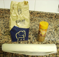 Os ingredientes são estes, açúcar branco, canela em pó e uma embalagem de massa folhada.